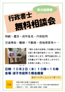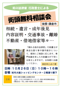 逗子と大船で無料相談会を開催します。相続や遺言、成年後見、離婚、借地借家など、身近なお困りごとや諸手続について、個別に相談に応じます。事前申込みは不要です。直接ご来場ください。